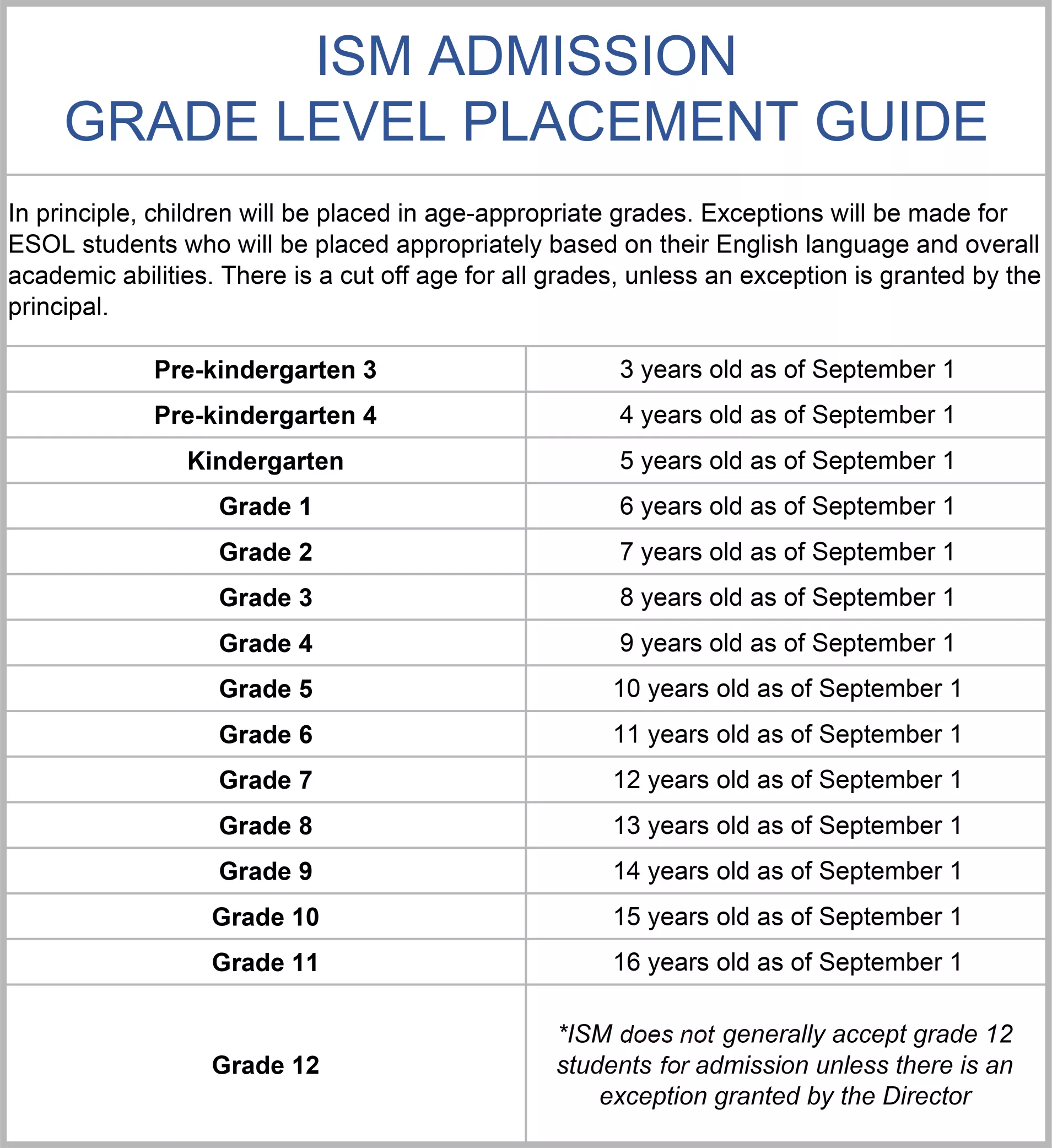ISM ADMISSION GRADE LEVEL PLACEMENT GUIDE